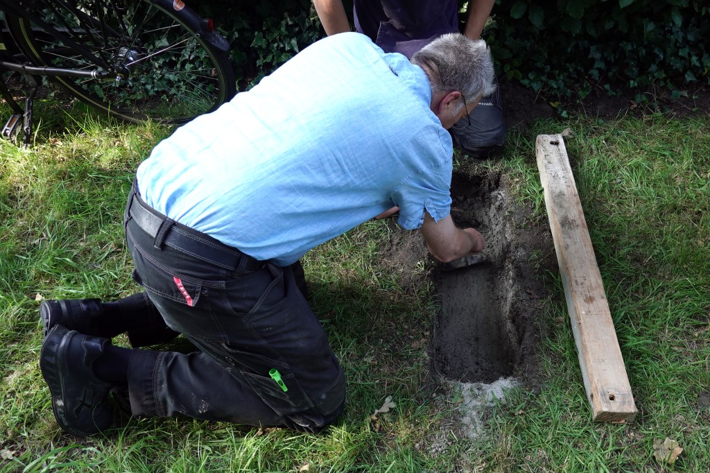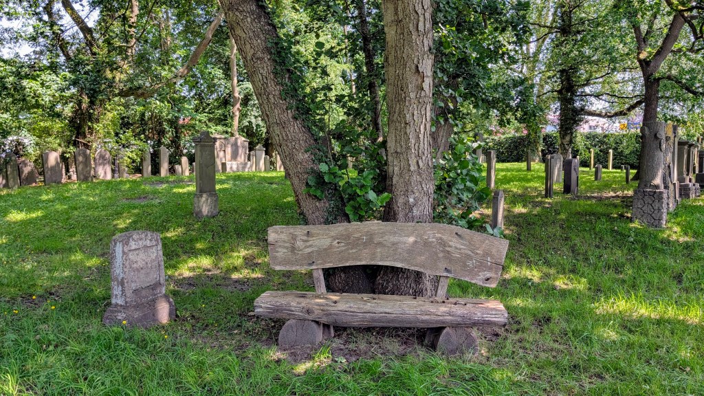 Am 13. Juni 2025: Die Bank ist fertiggestellt. Nun geht es darum, einen geeigneten Aufstellungsplatz zu finden. Wir haben uns dann entschlossen, die alte und eigentlich abgängige Bank stehen zu lassen und die neue Bank im linken, neuen Teil des Friedhofes direkt an der Hecke bei der Emder Straße aufzustellen. Man kann von dort aus seinen Blick über den gesamten Friedhof schweifen lassen.
