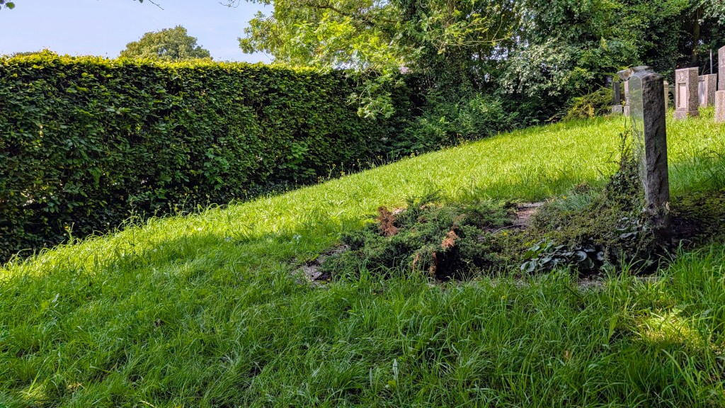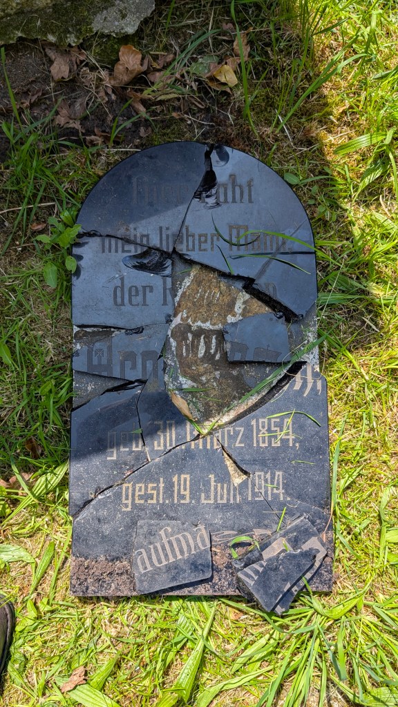 Viele Grabplatten auf dem alten Friedhofsteil waren im Laufe der Jahrzehnte total überwachsen von Moos und Gras. Ihre genaue Lage konnte man nur anhand der vorliegenden Verzeichnisse finden. Die Fotos entstanden am 2. Oktober 2024.