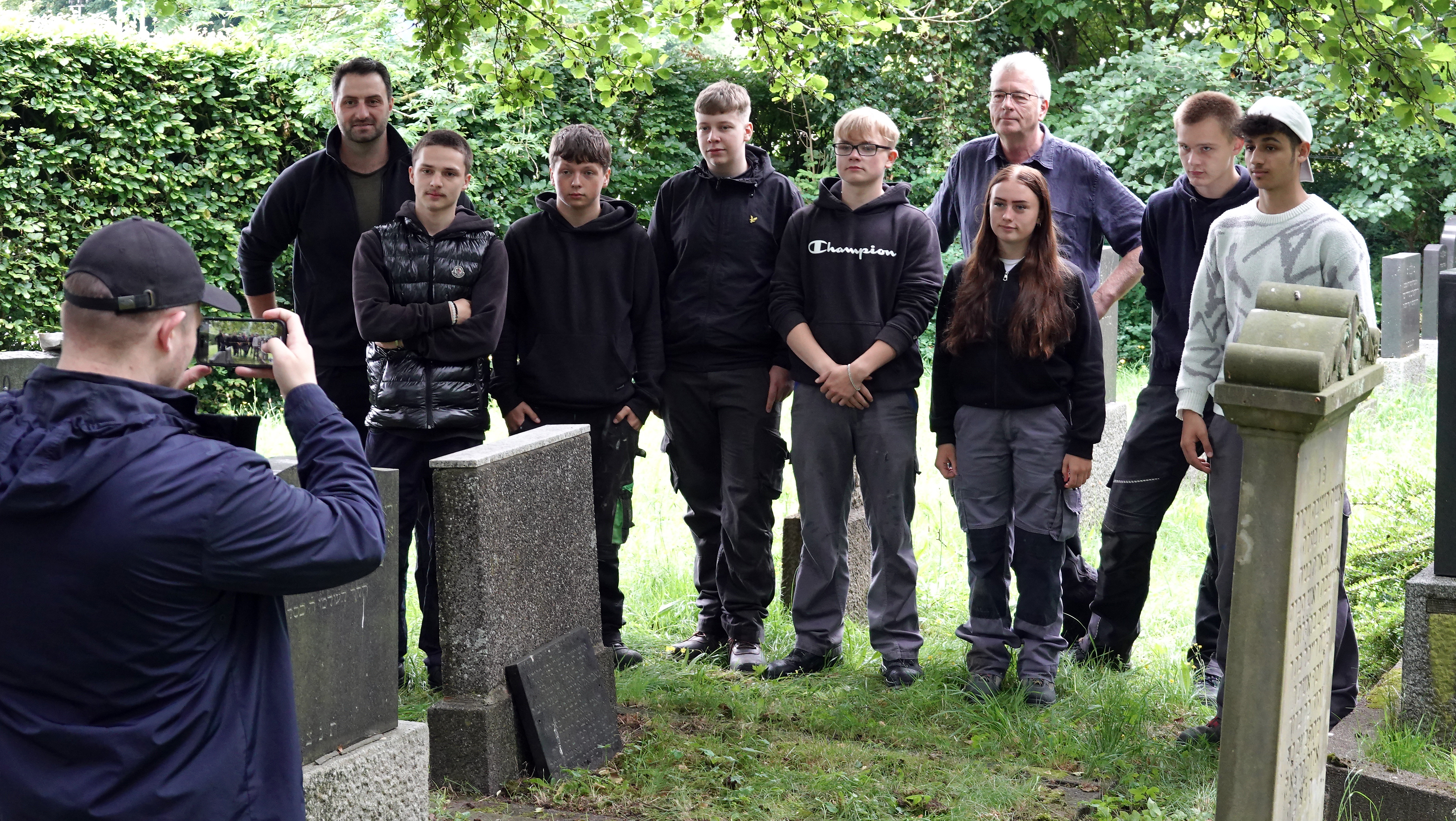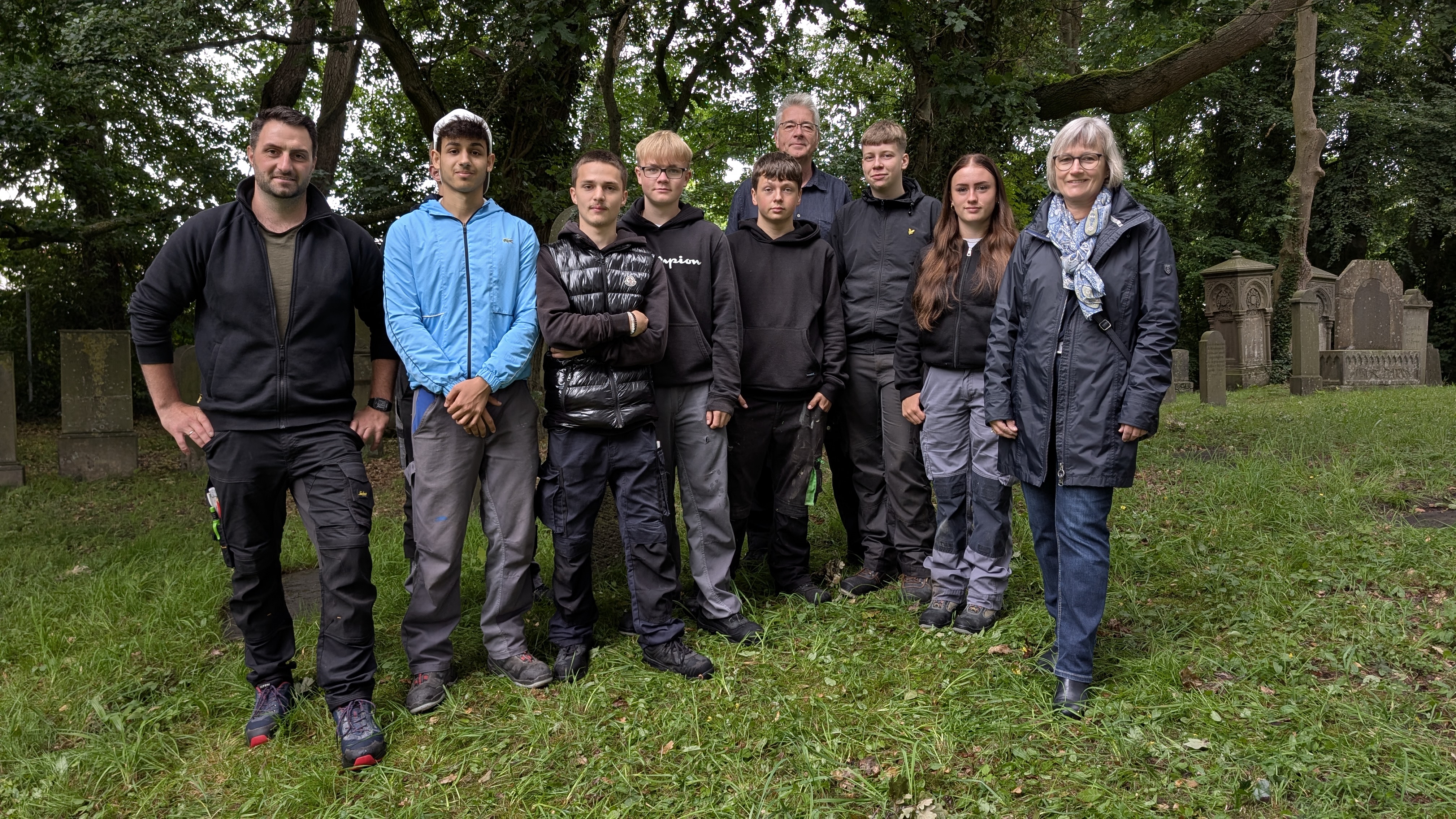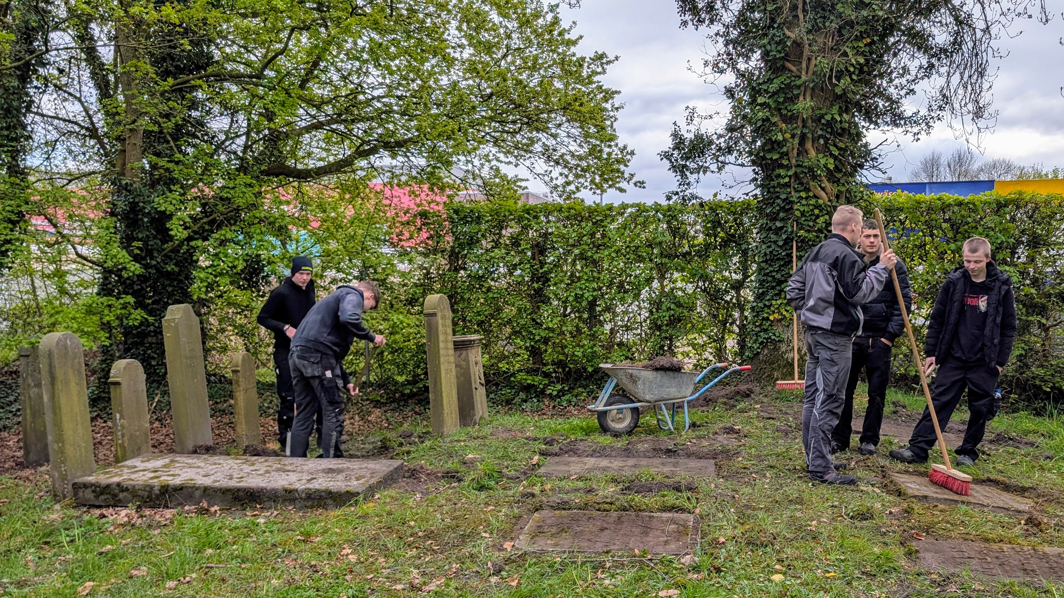 Am 22. April 2025 gingen die Pflegearbeiten weiter. Wieder hatte sich eine Reihe von Schülern mit ihrem Fachpraxislehrer Harmannus Cornelius daran gemacht, weitere Grabplatten auf dem alten Friedhofsteil freizulegen und zu säubern.