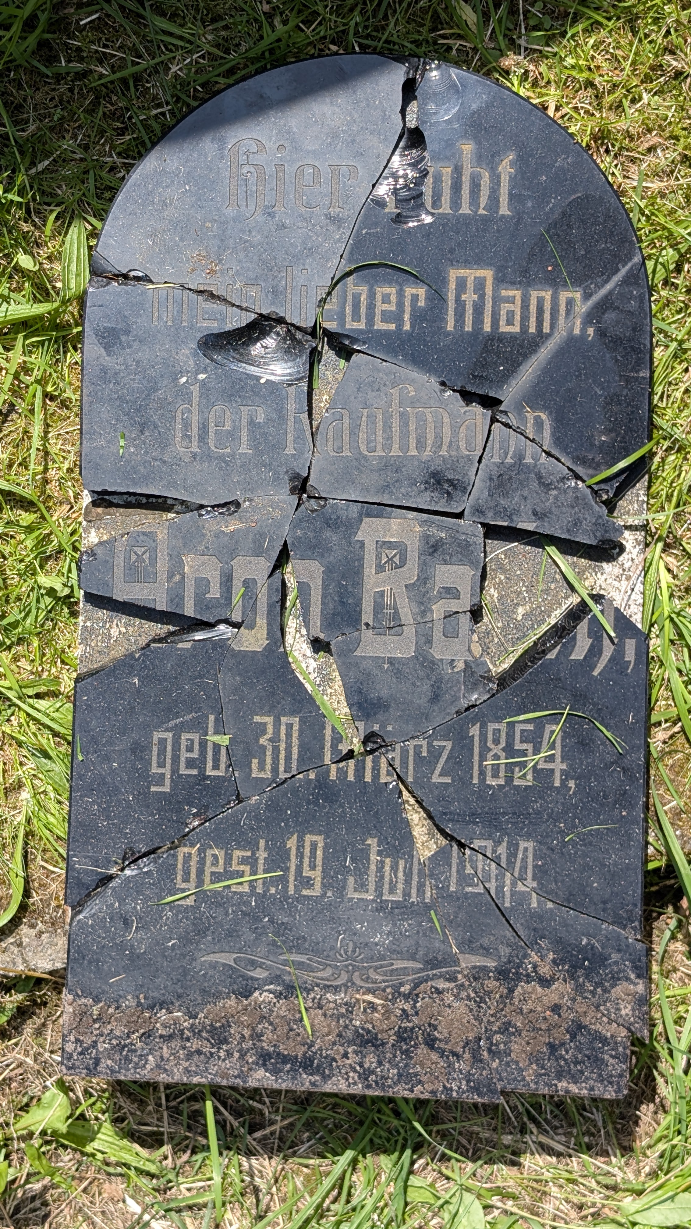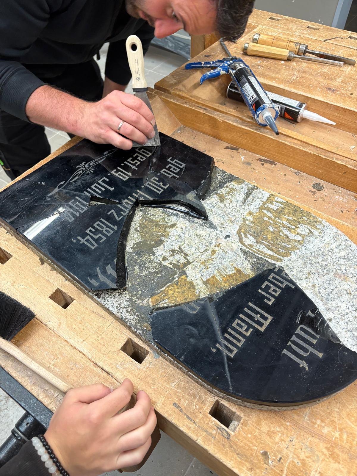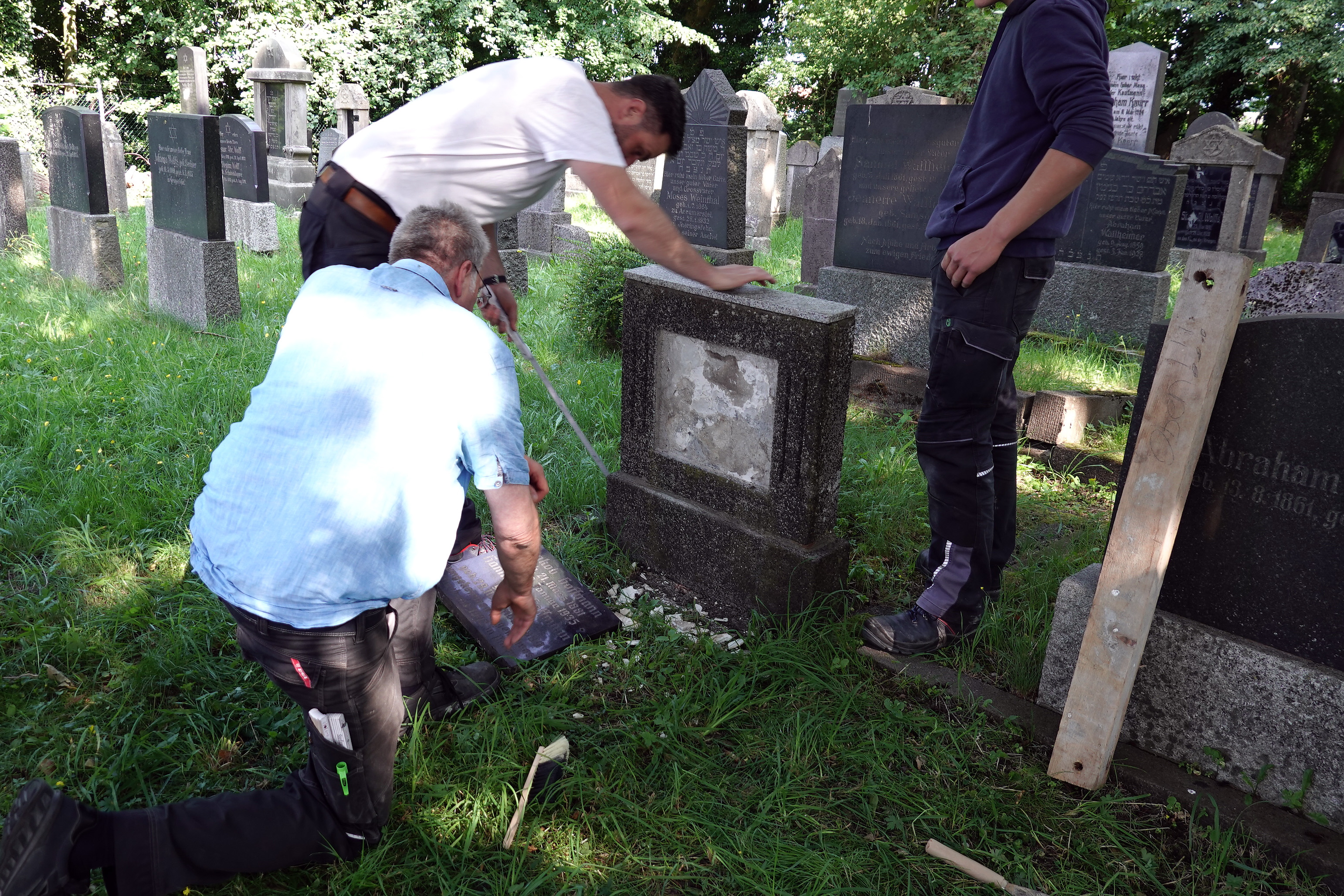 Vor den Sommerferien hatte Harmannus Cornelius die Bruchstücke der Grabsteinplatte von Aron Ballin vom Friedhof zur Schulwerkstatt gebracht. Hier wurde sie mit viel Herzblut so gut es ging wieder hergestellt. Am 8. Oktober konnte sie wieder in den Grabstein eingesetzt werden.